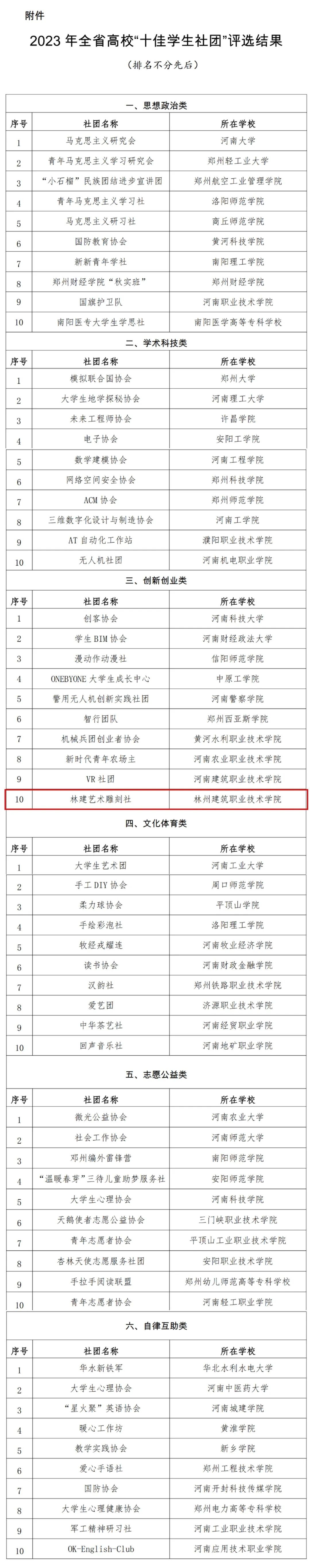 根据省委教育工委、省教育厅《关于开展2023年全省高校“十佳学生社团”评选的通知》(教思政函〔2023〕387号)要求,经学校推荐、专家评审等环节,评选出六类十佳学生社团共60支。其中林州建院艺术雕刻社入选高校“十佳学生社团”。