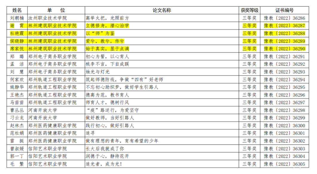 经省教育厅组织专家评审,我校上报的基础教学部(思政部)董豪老师的文章《洪疫无情,人间有爱》、基础教学部(思政部)黄丹愉老师的文章《上好思政课,做好引路人》荣获师德主题教育征文比赛二等奖,基础教学部(思政部)谢霄老师的文章《立德修身、潜心治学》、基础教学部(思政部)杜艳霞老师的文章《以“师”为鉴》、数字经济系侯晓静老师的文章《爱兮,教兮,传兮》、基础教学部(思政部)席家悦老师的文章《始于真实,显于点滴》荣获师德主题教育征文比赛三等奖。
